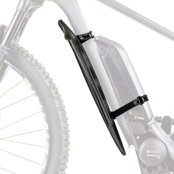 Sprednji blatnik idealen za e-kolesa in "plus" kolesa. Nameščen na spodnjo cev okvirja, ga je mogoče pritrditi tudi z baterijo okvirja na električna kolesa.